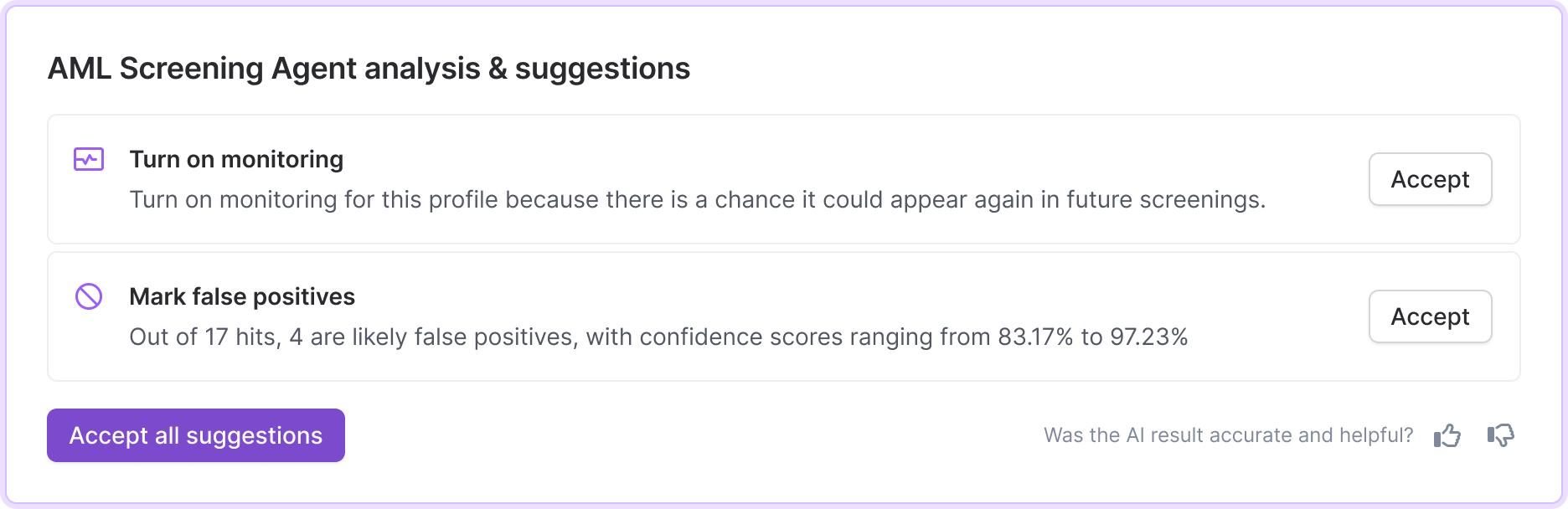 Clicking this triggers the AI to evaluate the AML Customer Screening hits in real-time by: