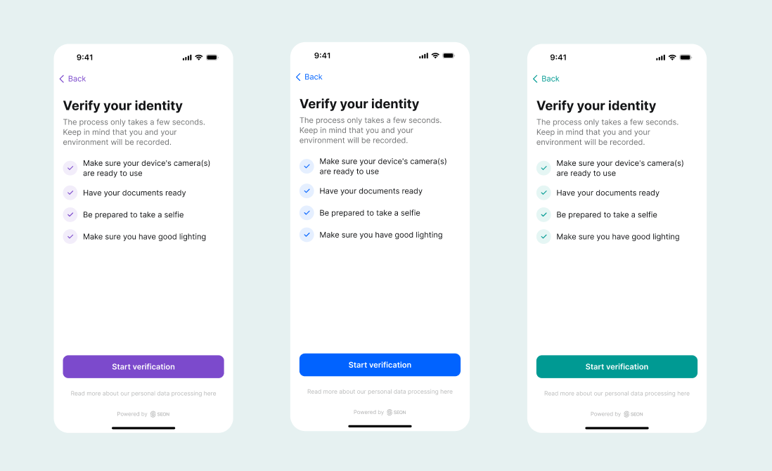 The Identity Verification (IDV) flow can be customized to match your brand. You can adjust colors, fonts and logos to keep the experience consistent with the rest of your product.