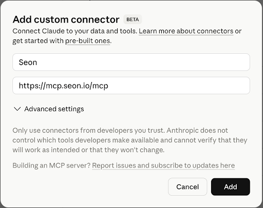 Give the connection a name (for example, "SEON") and paste your SEON MCP endpoint. Use the endpoint for your SEON region: