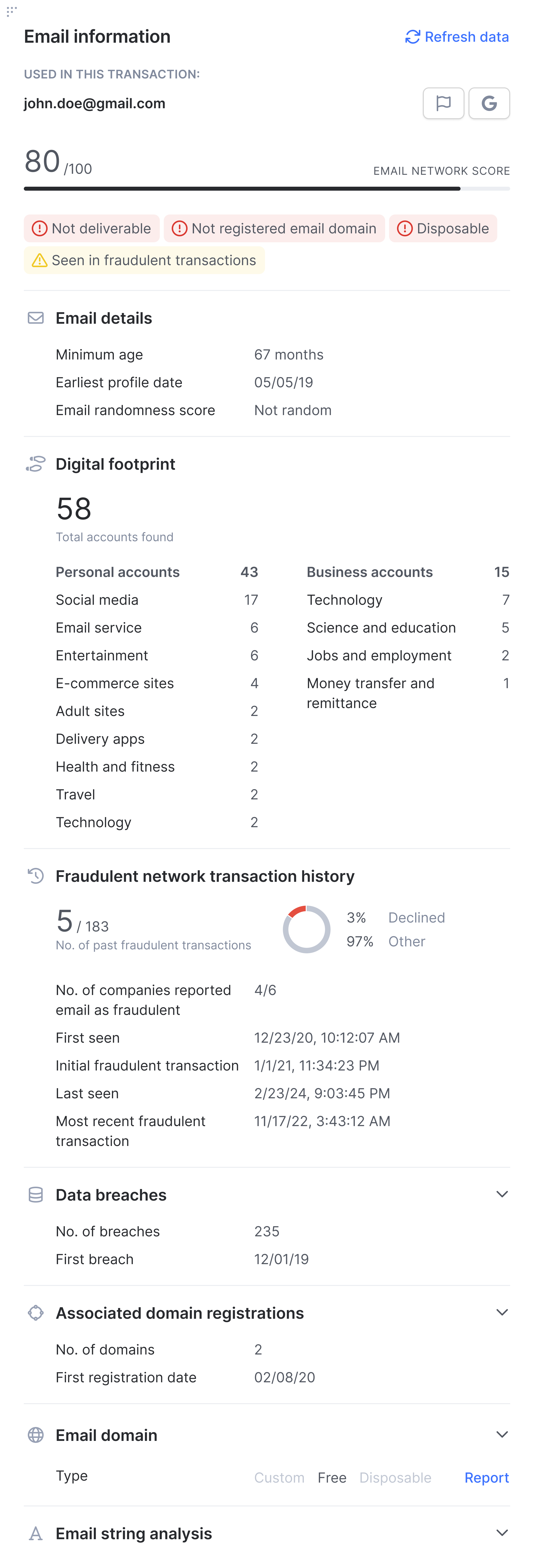 New proprietary network score is available for email, which can be used as a confidence indicator when assessing a user's digital profile. This score leverages AI and machine learning alongside consortium data from over 5,000 customers. Network score is derived from an anonymized model trained on millions of onboarding events with over six years of historical data, ensuring precise and accurate risk assessments.