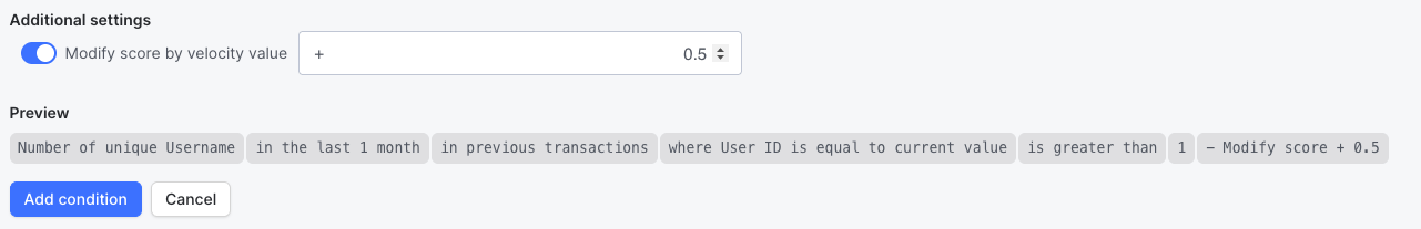 Velocity rules include an optional Modify score setting that dynamically adjusts a rule’s score based on how much a value exceeds (or falls below) a defined threshold.