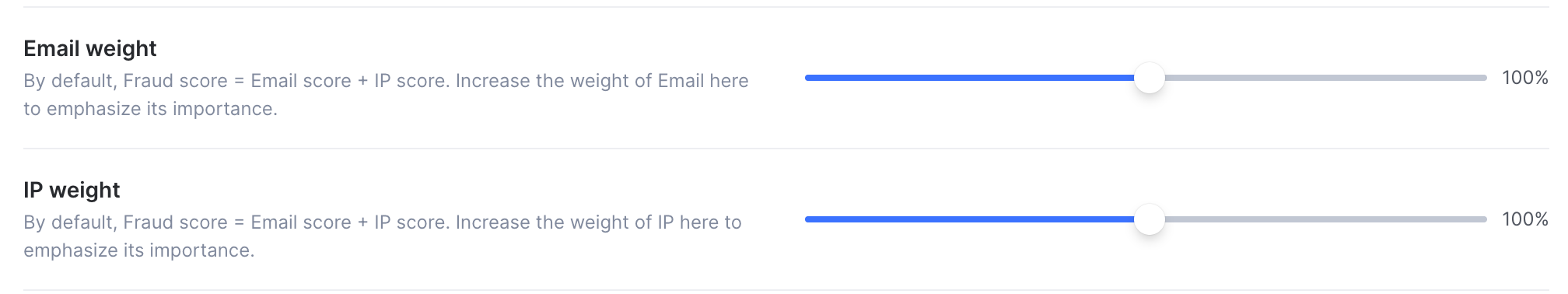 You can adjust how strongly email and IP rules affect the fraud score by applying score weights in the Settings page.
