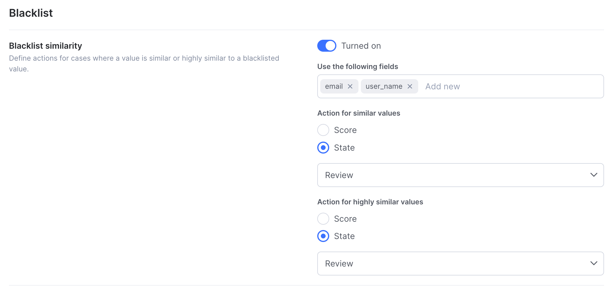 - As a state-based rule: The similarity match directly determines the transaction’s state (APPROVE, REVIEW or DECLINE), overriding regular score calculation.
