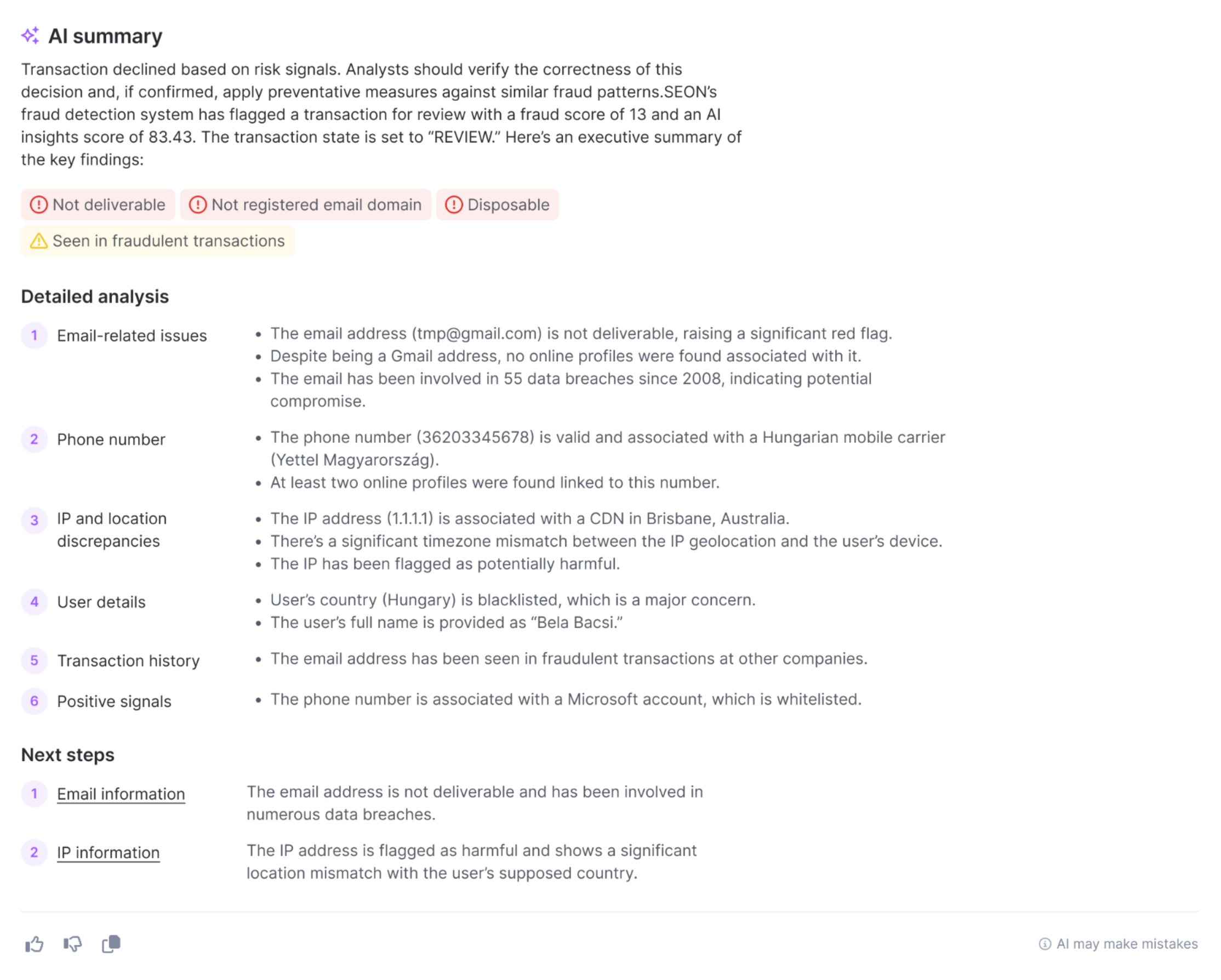 • Next best actions: The AI Summary offers recommended next steps for analysts, such as verifying information, blocking further action or investigating specific signals.