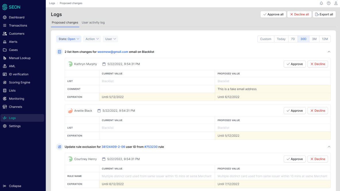 When the four-eye principle is enabled, certain sensitive changes require approval from a designated second user. This reduces the risk of misconfiguration or malicious changes, creates a clear audit trail and helps teams safely scale and operate fraud rules with confidence.