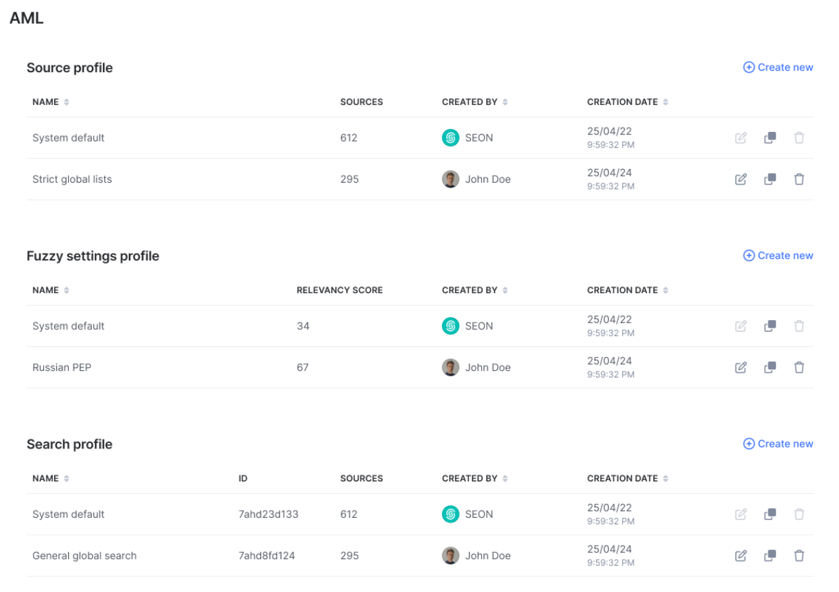 In addition to offering extensive data coverage and ensuring compliance requirements are met, SEON allows you to personalize AML search profiles and adjust source and fuzzy search settings, enabling you to fine-tune AML screening to match your specific needs. See our detailed guide on search profiles.