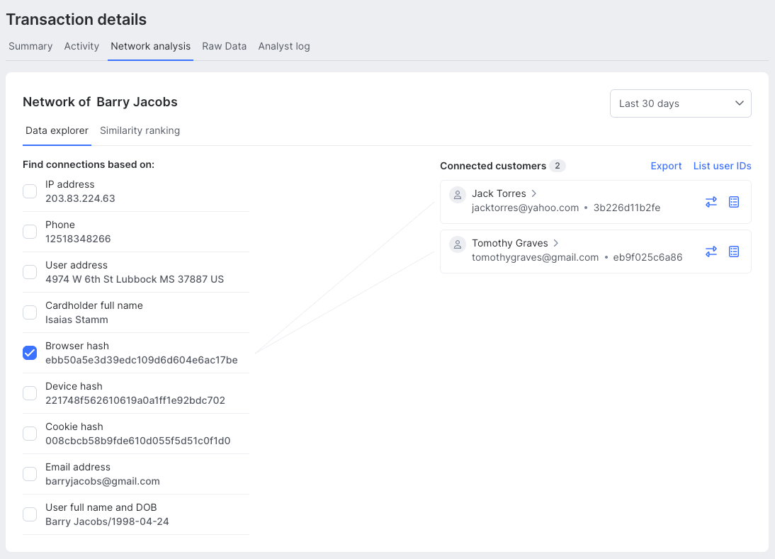 The Network analysis tab allows you to investigate the data relationships between the customer for the current transaction and other related customers.