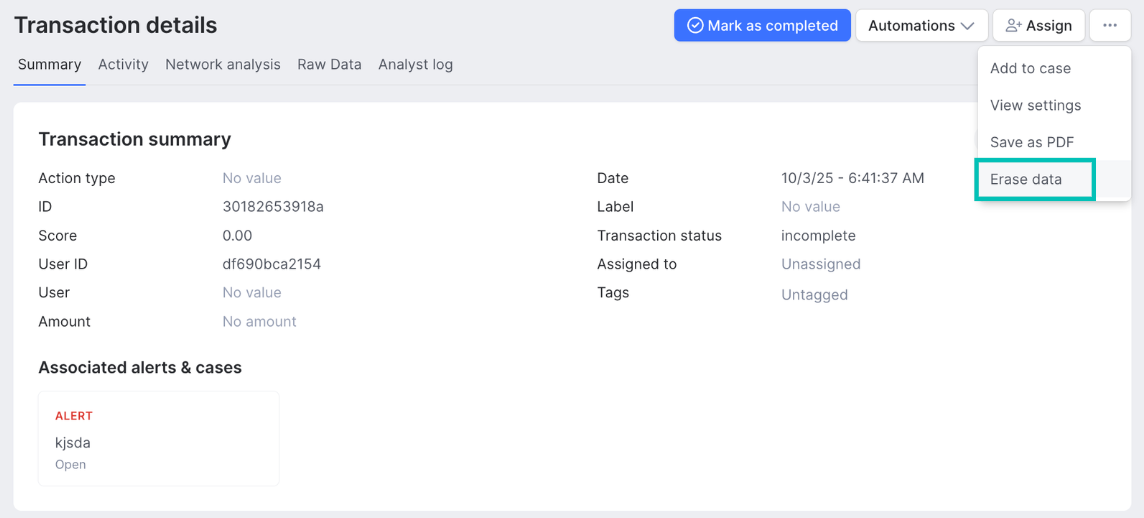 You can find this option at the top right corner of the page of a given transaction. Click Erase data to delete all information tied to the User ID that initiated the selected transaction.