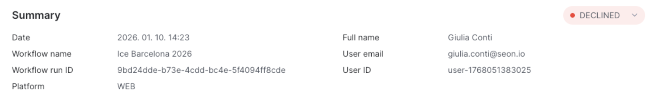 Clicking on any workflow run opens the workflow run details page. This page is your primary tool for manual reviews, fraud investigations and understanding identity verification decisions.